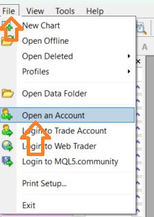 To get started, launch your MT4 Desktop Version and locate the “File” menu at the top-left corner of the platform’s interface. Click on it to reveal a drop-down menu containing various options. Among these options, you will find “Open an Account.” Select this option to proceed.