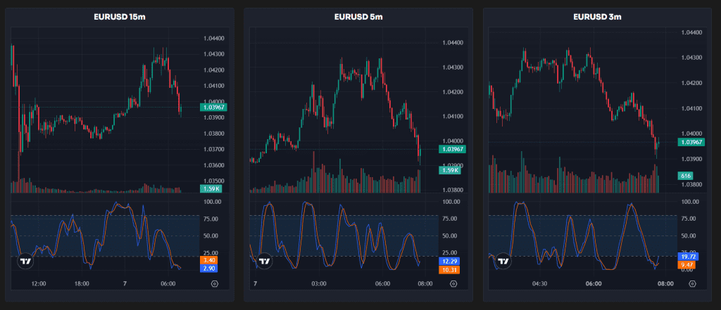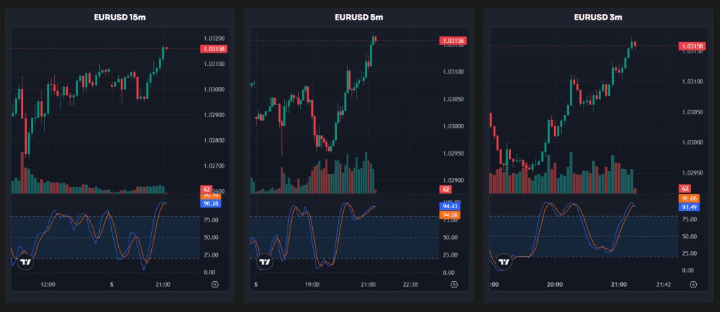 Scalping in the forex market requires quick decision-making and a structured approach to identify high-probability trades. Using EUR/USD charts on 15-minute (15m), 5-minute (5m), and 3-minute (3m) timeframes in conjunction with the Stochastic RSI indicator, we can enhance the accuracy of our trades through timeframe confluence, indicator alignment, and direction confirmation. Here’s how: